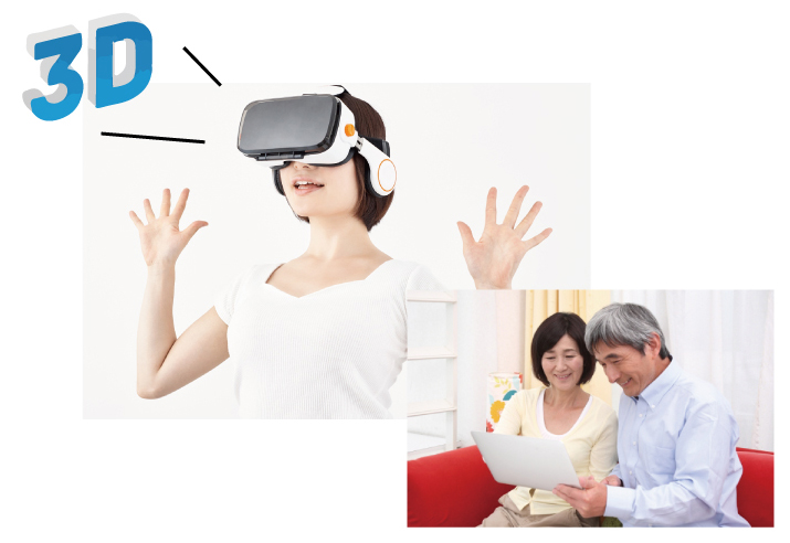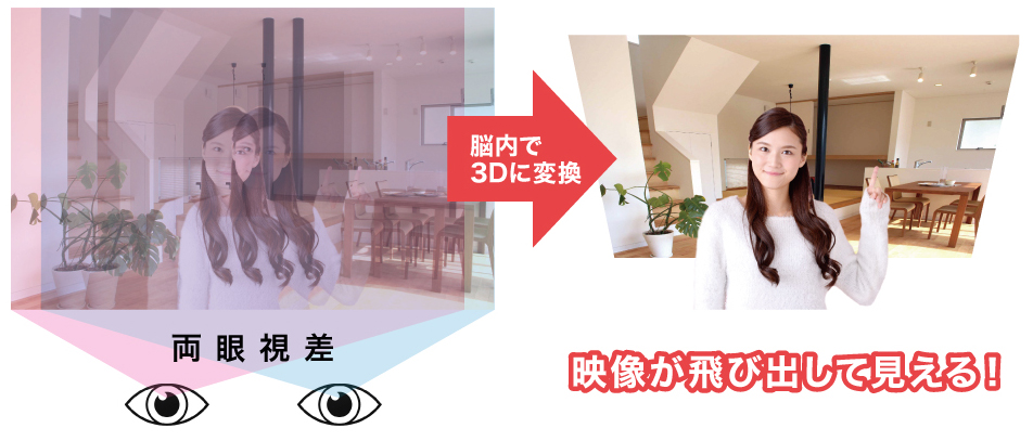 左右の眼で像を立体視する人間の眼の 特性:「両眼視差」を応用した仕組みです。 左眼用・右眼用を同時に撮影した「両眼 視差」の映像が、人間の脳内で立体像: 3D映像として見ることができます。